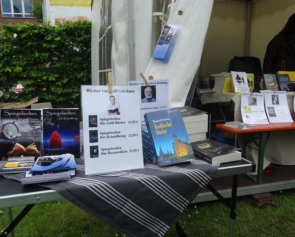 Die Idee von Axel Berger war genial und die Durchführung sehr zufriedenstellend. Der Pavillon wurde aufgestellt, das Rollup war rechtzeitig fertig, die neuen Flyer konnten verteilt werden. "Heinzelmännchen" deckten den Büchertisch, Helga Geßner wachte über den Verkauf und hatte für jeden Autoren die Bücherliste laminiert und am Tisch befestigt (Klasse Idee, die Wäscheklammern!) alle angemeldeten Autoren waren vor Ort und das Wetter spielte auch mit. Wir wurden eifrig fotografiert und vor allem gab es in der Presse vorher mehrere Ankündigungen. Eine schöne, erfolgreiche Aktion! Nun planen wir weiter, - im Herbst gibt es einen Autoren-Lese-Marathon! Die schönen Fotos sind von Rolf Glöckner