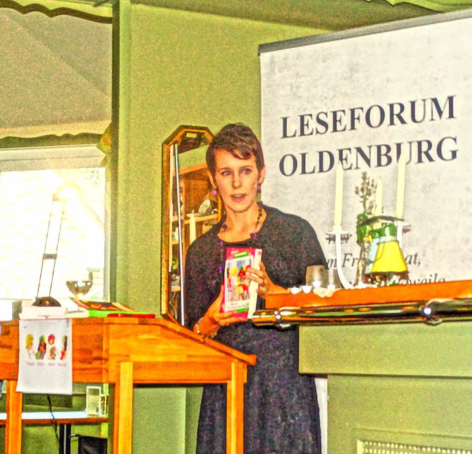 Die junge Autorin, 26 Jahre alt, stellte sich zunächst selbst vor. Sie lebt in der Nähe von Berne mit ihrem Mann, der Landwirt ist, und zwei Kindern, arbeitet als Hotelfachfrau in Ganderkesee und absolviert gerade ein Fernstudium zur Hotelbetriebswirtin. Gelegentlich hilft sie im landwirtschaftlichen Betrieb ihres Mannes mit und hat dennoch genug Zeit zum Lesen und seit September auch zum Schreiben. Das macht ihr nicht nur große Freude, sondern geht ihr auch flott von der Hand. Sie berichtet, dass ihre Figuren so lebendig geworden seien, dass sie ihr die Handlung diktierten.