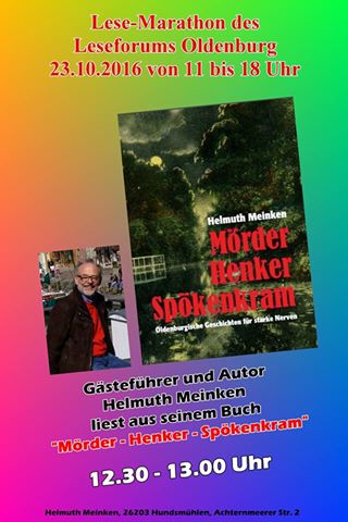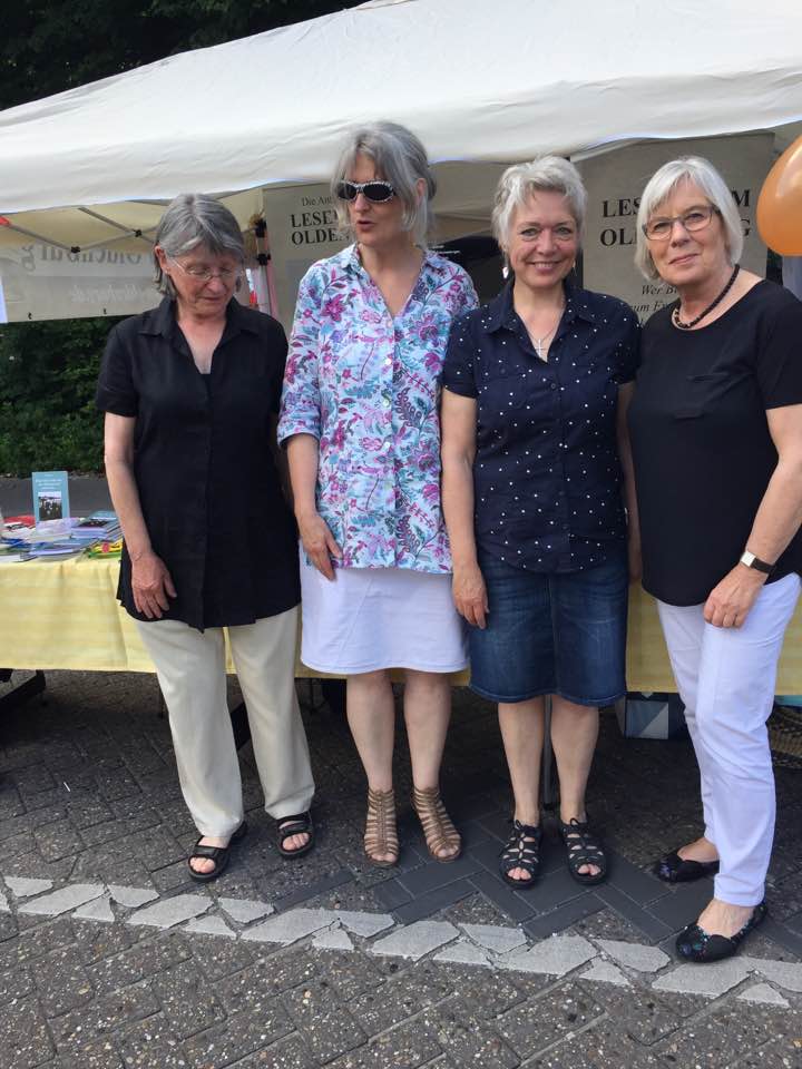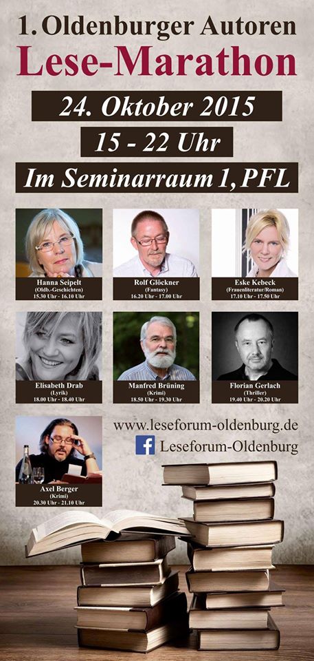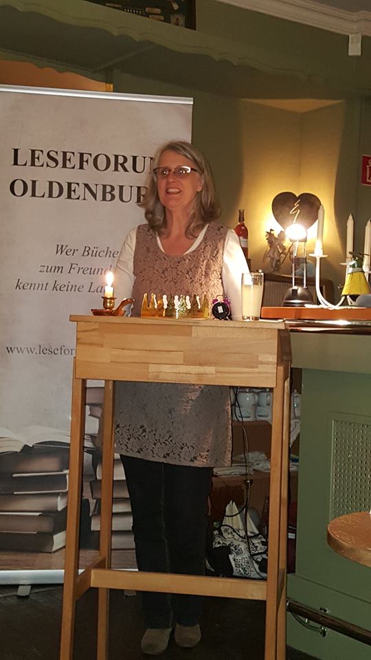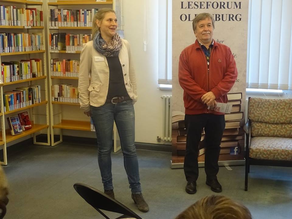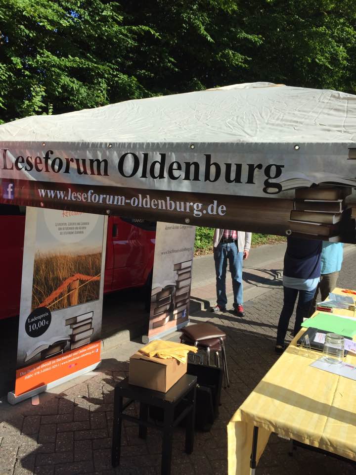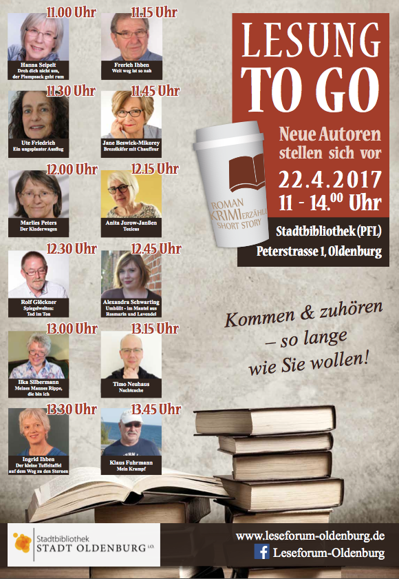Am Samstag, 22.4.2017, fand aus Anlass des Welttags des Buches in der Stadtbibliothek Oldenburg das zweite Mal eine „Lesung to go“ mit dem Leseforum Oldenburg statt. In der Zeit von 11.00 bis 14.00 Uhr stellten sich zwölf Autoren und Autorinnen mit kurzen Lesungen aus ihren Werken vor. Nach Begrüßung durch Frau Simon von der Stadtbibliothek und durch den Moderator des Leseforums Wolfgang Wulf las zunächst Hanna Seipelt aus „Dreh´dich nicht um, der Plumpsack geht rum - Kindheitserinnerungen aus Oldenburg in der Nachkriegszeit“; gefolgt von Frerich Ihben mit einem Abschnitt aus seinem historischen Roman „Weit weg ist so nah“. Danach las Ute Friedrich aus ihrer Kurzgeschichte „Ein ungeplanter Ausflug“. Dann konnte man Jane Beswick-Mikorey lauschen, sie erzählte aus dem „Brezelkäfer mit Chauffeur“. Marlies Peters hatte ebenfalls autobiografisches im Gepäck und las einen Abschnitt mit dem Titel „Der Kinderwagen“ aus ihrem neuen Roman. Anita Jurow-Janßen setzte die Lesungen fort mit einem Ausschnitt aus ihrem Thriller „Toxicus“. Anschließend konnte man Rolf Glöckner zuhören, der aus seinen „Spiegelwelten – Tod im Ton“ etwas zum Besten gab, gefolgt wiederum von Alexandra Schwarting, die ihr Romandebüt „Umhüllt – im Mantel von Rosmarin und Lavendel“ vorstellte.