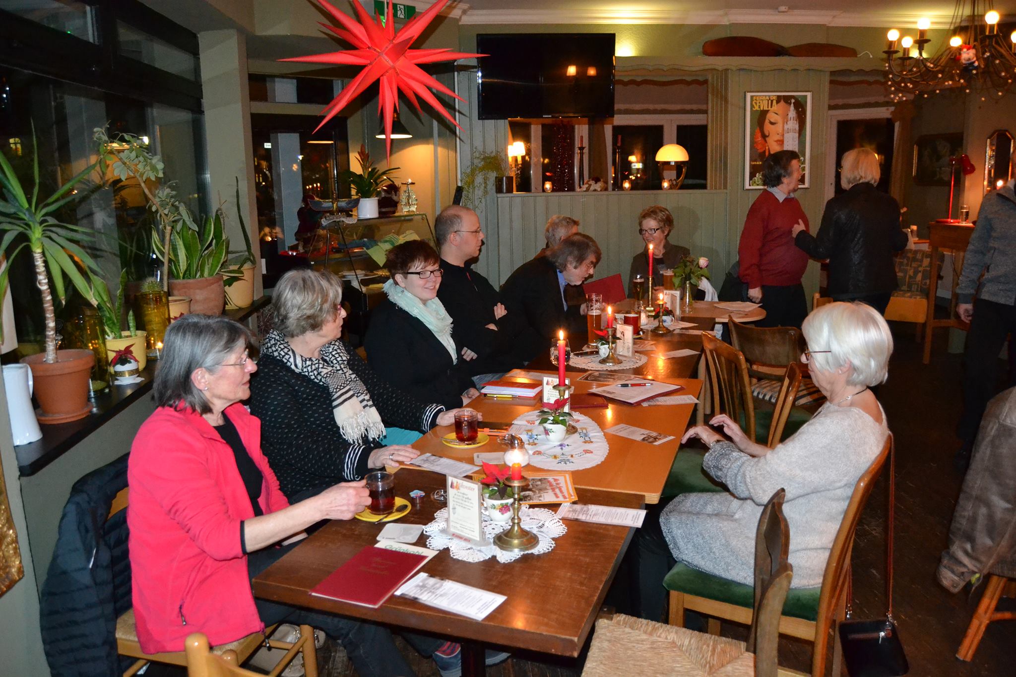 Das letzte Treffen vom Leseforum des Jahres 2015 erfreute uns am 8. Dezember, wie immer im „Mephisto“. Unser Raum war weihnachtlich geschmückt, mit vielen Kerzen und einem großen roten Stern, der warm über einer langen Tafel leuchtete. Die freundliche Einführung der lesenden Autoren hatte wieder Wolfgang Wulf übernommen, der uns in seiner kenntnisreichen und einfühlsamen Art auf die Lesungen einstimmte.Als Erste sprach Elke Bergsma, die auf ihrem Weg von Leer nach Oldenburg knapp einem schweren Unfall entgangen war, über Anfang und Fortgang ihres Schreibens. Innerhalb der letzten 2 Jahre hat sie schon 12 ihrer spannenden und erfolgreichen Ostfriesenkrimis geschrieben. Sie stammt aus der Gegend und hat einen besonderen Blick auf die Eigenheiten der dortigen Menschen, was den Figuren ihrer Bücher eine besondere Echtheit verleiht. Man sieht sie förmlich vor sich! Wir hörten drei Szenen aus ihrem Buch „Brandwunden“, angefangen mit dem Mord an einem Bestatter, dann fortgeführt mit dem Tod einer alten Frau bei einer Brandstiftung. Ein Feuerteufel geht um und noch mehr Menschen müssen sterben. Ganz besonders ergriffen hat uns die Beschreibung eines Rettungsversuches zweier Kinder durch eine Frau, die dabei vielleicht ihr Leben lassen musste. Aber an diesem hochspannenden Punkt hat uns Elke Bergsma dann mit allerlei Vermutungen über den Fortgang der Geschichte im Unklaren gelassen. Ein Grund mehr, ihre Bücher zu kaufen. Am Ende ihrer Lesung stellte sie sich den interessierten Fragen der Zuhörer und sprach auch über die verschiedenen Arten der Vermarktung. Nach einer kurzen Pause stimmte uns Reinhold Friedl mit seiner warmherzigen Erzählung „Der Messias von der Oste“ auf weihnachtliche Gedanken ein. Mit Gefühl und Humor ließ er uns teilhaben an der Reise des Protagonisten nach Israel und seinem Erzählen davon im Kreis von Jugendlichen. Da wurde das reiche Innenleben eines alten Mannes der Unbekümmertheit von jungen Menschen, die im heutigen Informationszeitalter leben, gegenübergestellt und dem Zuhörer erschienen diese beiden Welten gar nicht so weit voneinander entfernt. Mit leckerem Essen und lebhaftem Gespräch über das Gehörte klang der Abend harmonisch aus. (Bericht Sylvia Didem)