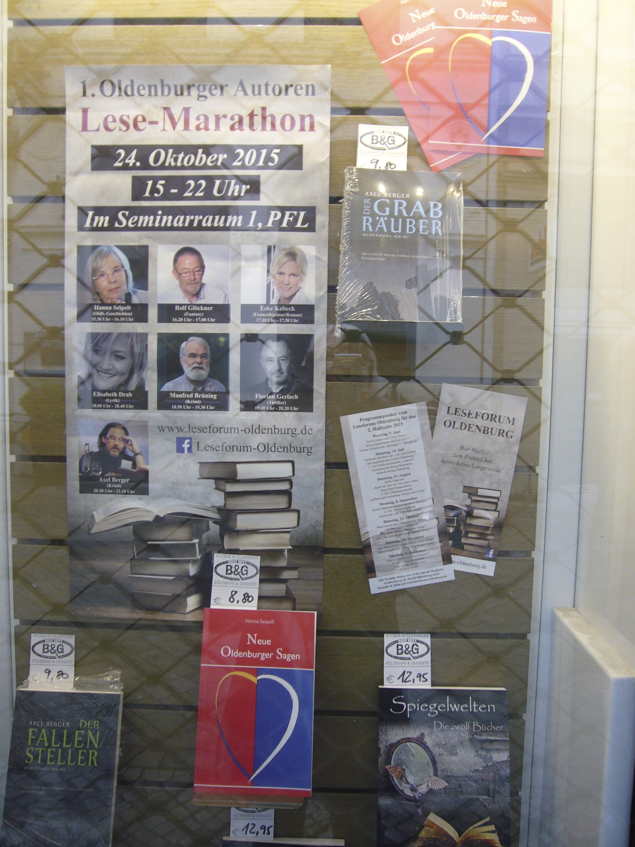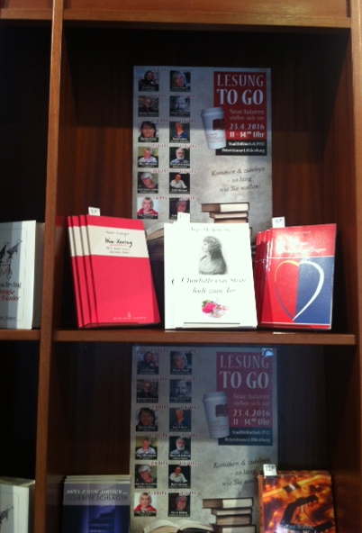 Für den 1.Autoren-Lesemarathon vom Leseforum hat uns nun auch die Buchhandlung Bültmann & Gerriets eine schöne Ausstellung der Bücher von den beteiligten Autoren in einem der Schaufenster hergerichtet. Wir freuen uns darüber und sind stolz.