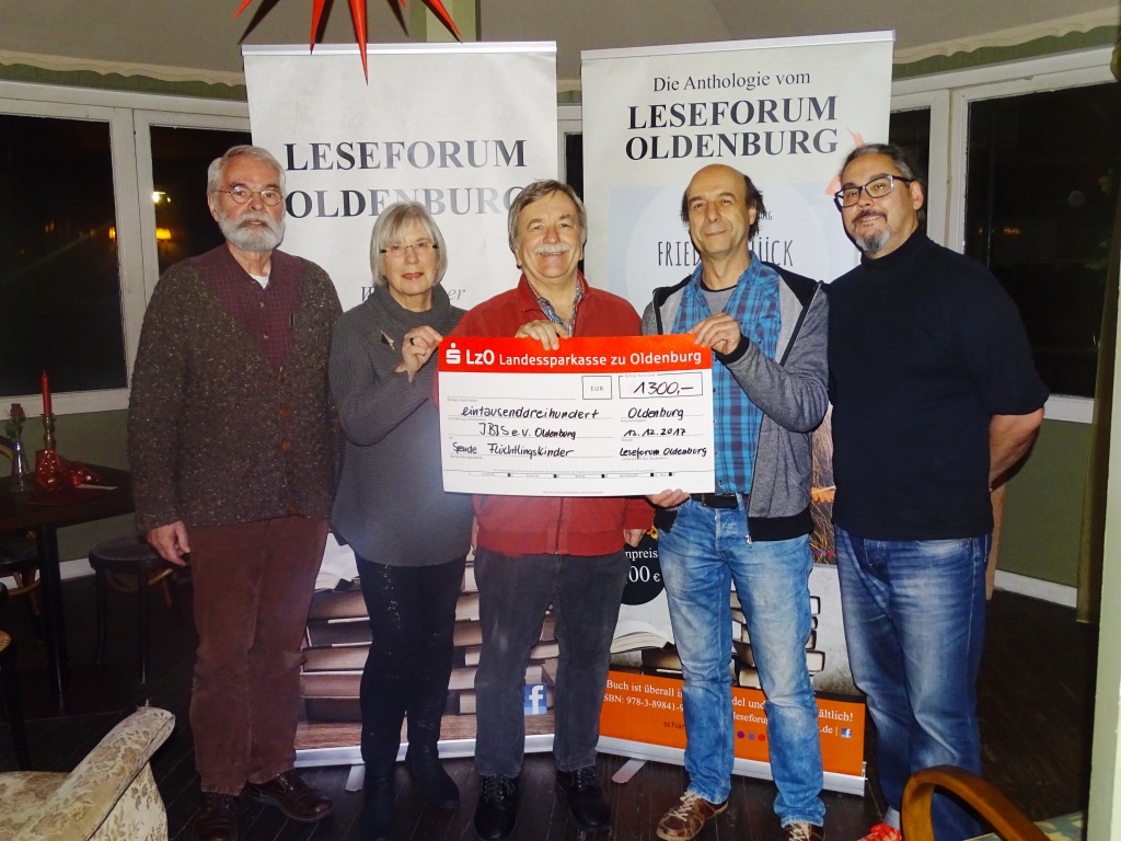 Die Autorinnen und Autoren vom Leseforum Oldenburg konnten bei Ihrem Weihnachtstreffen am 12.12.2017 Herrn Uwe Erbel von IBIS e.V. für die Arbeit mit traumatisierten Flüchtlingskindern eine Spende in Höhe von 1.300,00 Euro überreichen. Die Spendensumme von 1000,00 Euro kam bei vielfachen Benefiz-Veranstaltungen, die von den Leseforum-AutorInnen im Jahr 2017 organisiert wurden, zusammen und wurde durch Teilerlöse aus der gemeinsamen Anthologie zum Thema "Frieden, Glück - Heimat" durch den Schardt-Verlag auf den Gesamtbetrag aufgestockt.