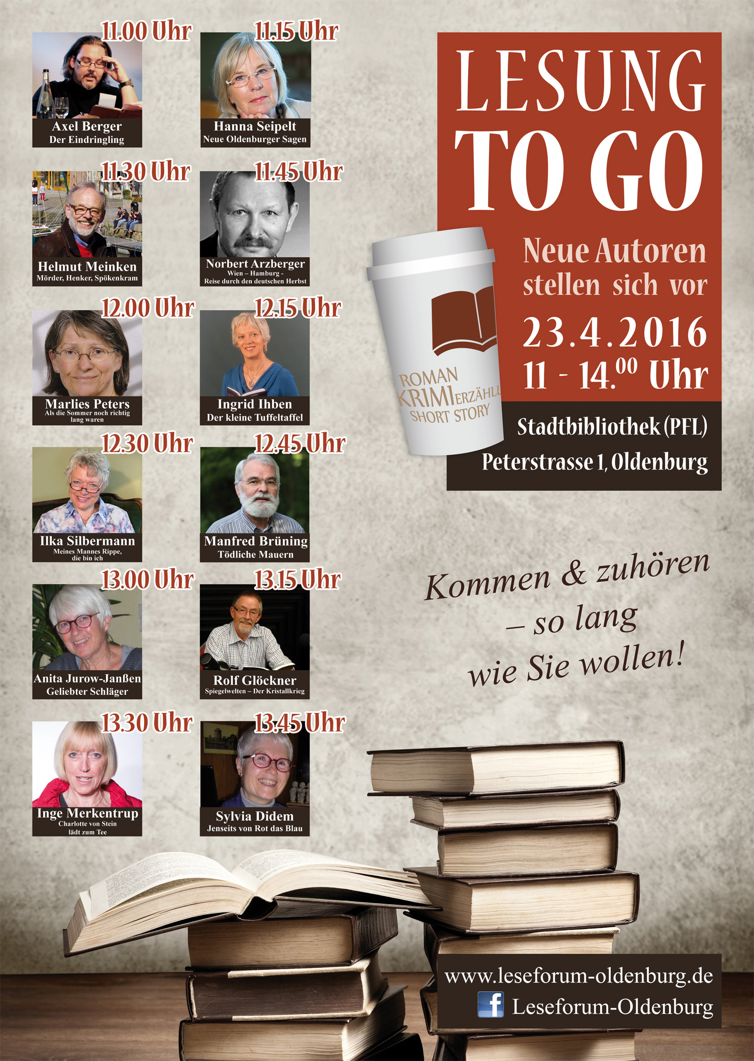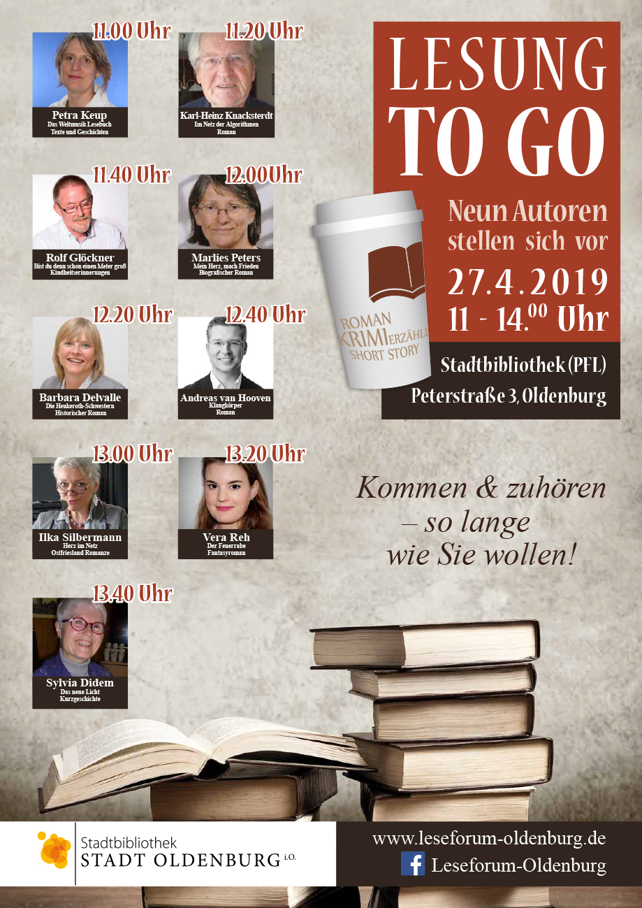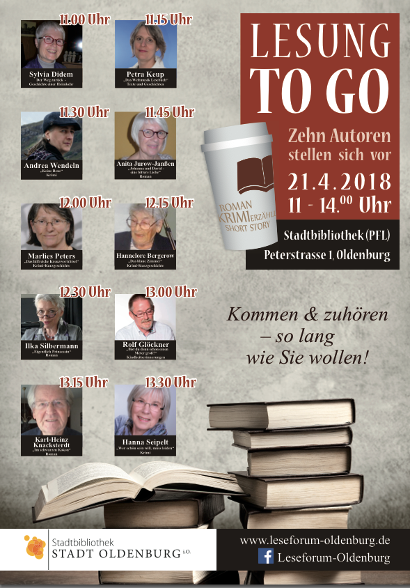 Am Samstag, 21. April 2018, ist es wieder so weit: Bei der „Lesung to go“ gibt es von 11 bis 14 Uhr in der Stadtbibliothek Oldenburg, Peterstr. 1, nicht nur einen Kaffee, sondern auch eine oder mehrere Lesungen „zum Mitnehmen“. Zehn Autorinnen und Autoren des Leseforums Oldenburg werden viertelstündlich sich selbst und ihre Bücher vorstellen. Sie entführen die Zuhörerinnen und Zuhörer in kurzen Geschichten oder Roman-Auszügen in ihre literarischen Welten. Die kostenfreie Veranstaltung kann jederzeit ohne Anmeldung besucht werden.