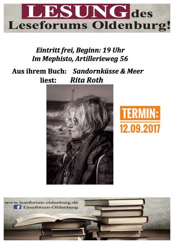 Ankündigen dürfen wir dazu die Lesung von Rita Roth aus ihrem Roman Sanddornküsse & Meer